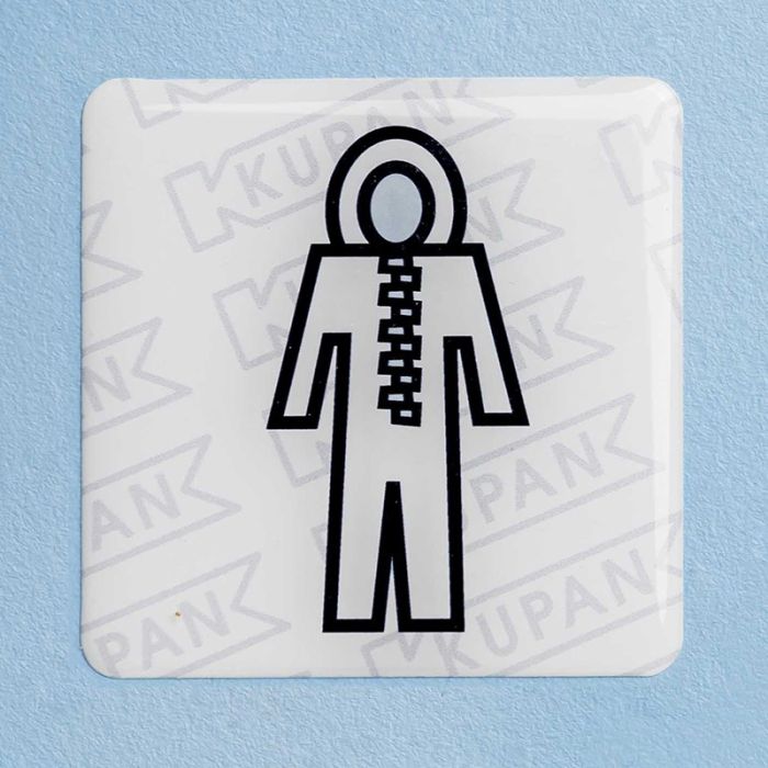 Doming Sticker voor de uitgifte van disposable overall met capuchon.