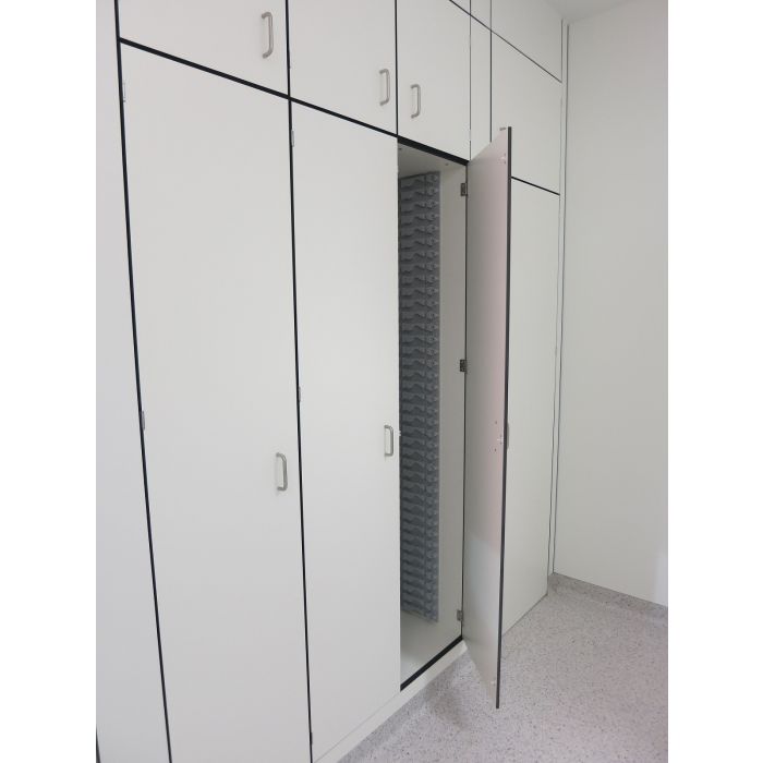 Laboratiorium onderkast voor werktafels voor staand werken met 2 vleugeldeuren, 1 legbord breedte 1208 mm. Robuuste onderbouwkasten van Compact HPL plaatmateriaal.