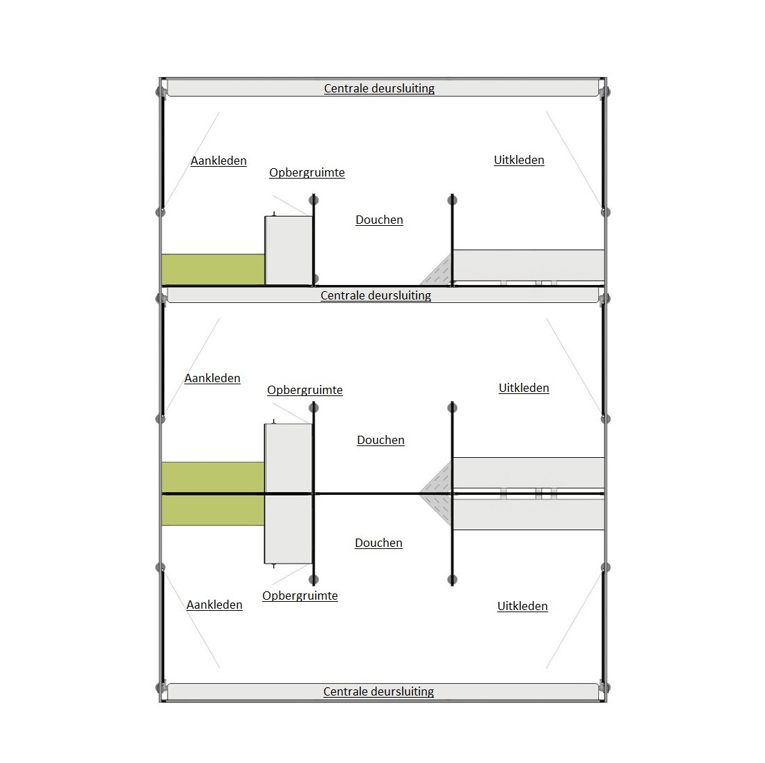 Een belangrijk onderdeel van de hygiënemaatregelen binnen de tuinbouwsector is de verplichting van één of meerdere douches in de hygiënesluis. Hoewel Kupan de douches zelf niet levert, voorzien wij in de bouw van sanitaire wanden voor zowel de sluis als de doucheruimte. Onze wanden zijn zodanig geconstrueerd dat ze met een centraal vergrendelingssysteem zowel de toegang tot de sluis als de uitgang naar de teeltfaciliteit beheersen, waardoor de kans op kruisbesmetting wordt verkleind.