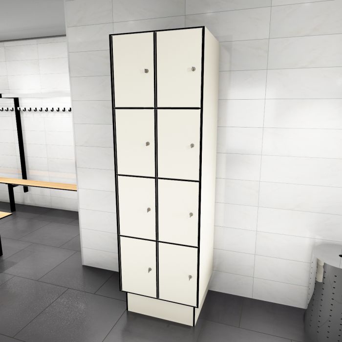 Deze locker beschikt namelijk over 2 kolommen met 4 deuren boven elkaar (totaal 8-deuren) en is geschikt in vochtige ruimtes. De Kupan lockers worden compleet geassembleerd geleverd en zijn zelf eenvoudig te monteren. De 4TL-300 locker dient enkel op een onderstel geplaatst te worden. De Kupan lockerkasten hebben terugliggende deuren. Dit maakt de lockers inbraak werend. Daarnaast zorgen deze deuren voor een optisch fraai vlak front. De Kupan lockers kunnen geleverd worden met verschillende type sloten. Afhankelijk van het gekozen slot is de locker 4TL-300 binnen vijf werkdagen leverbaar.