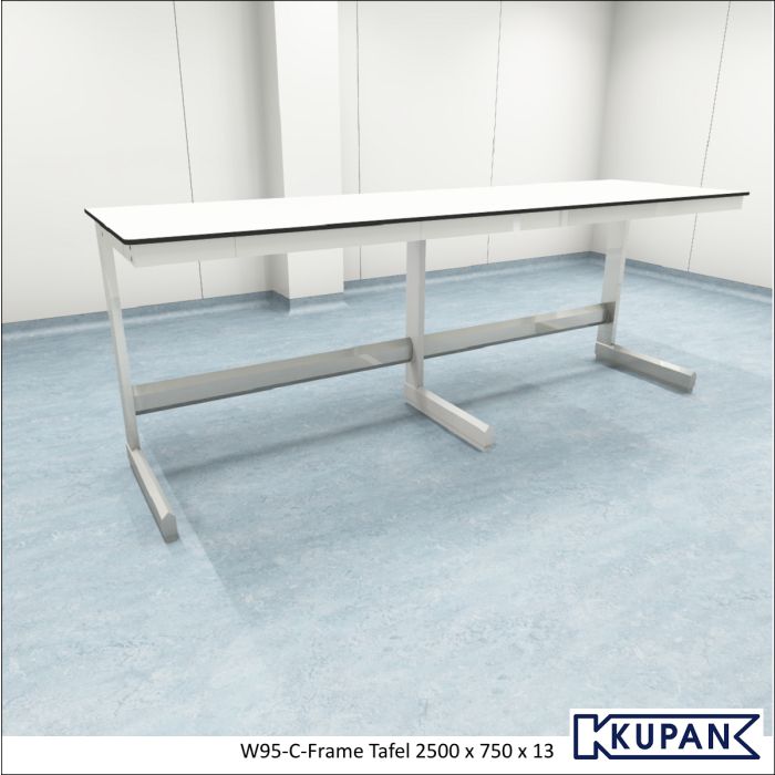 De tafels hebben een sterk buisframe met een 13mm compact HPL werkblad dat van onderaf wordt ondersteund met een speciaal profiel tegen doorbuigen. De constructie is zo gemaakt dat er een minimum aan naden is en daardoor makkelijk schoon te houden. De zijkanten zijn gemaakt van een naadloos gelaste C-frame constructie en de poten hebben stabiele stelpoten.