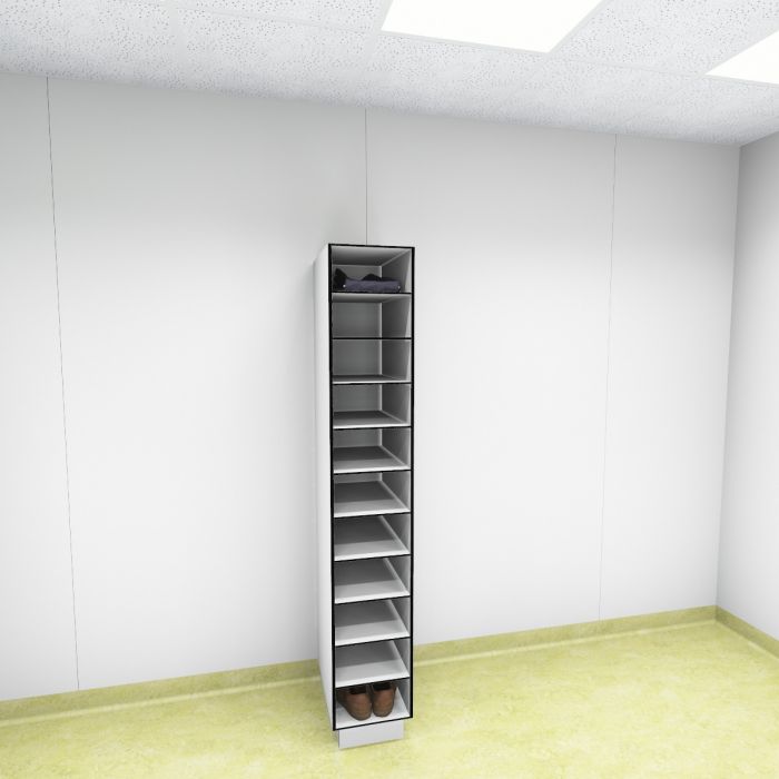 De open vakken kasten worden volledig van High Pressure Laminate (HPL) gemaakt. Dit zorgt niet alleen voor een hele stevige oplossing, maar ook één die hygiënisch van zeer hoge kwaliteit is. De kasten zijn waterbestendig, hufterproof en niet krasgevoelig.